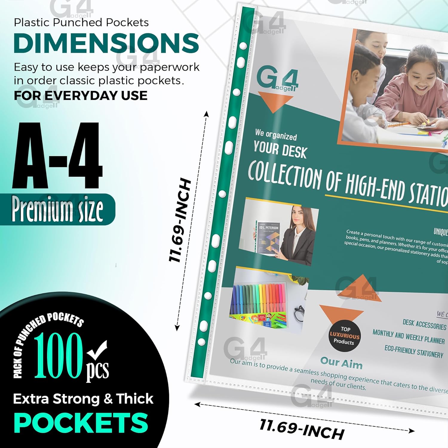 A4 punched pocketsCrystal clear finish30 micron polypropyleneReinforced, multi-punched filing stripPack of 100