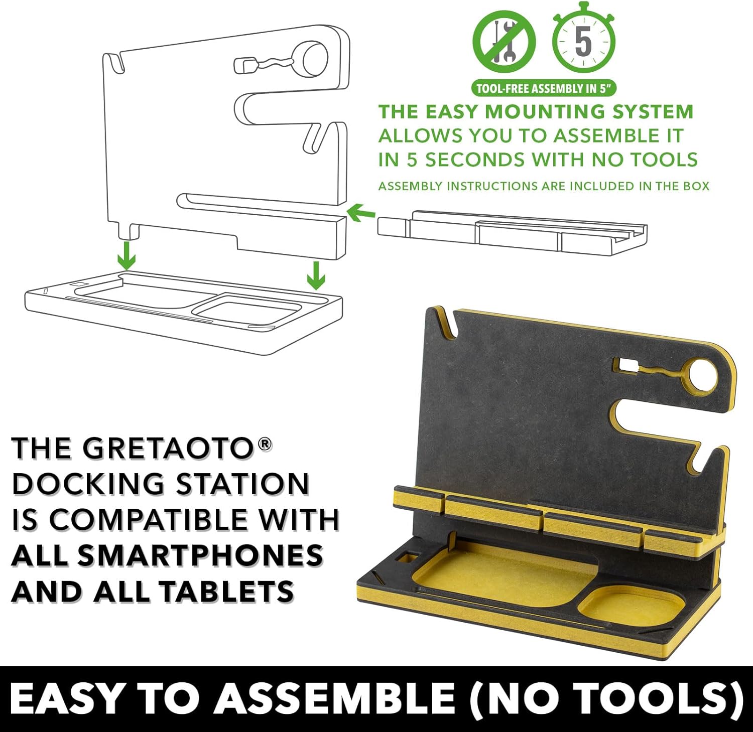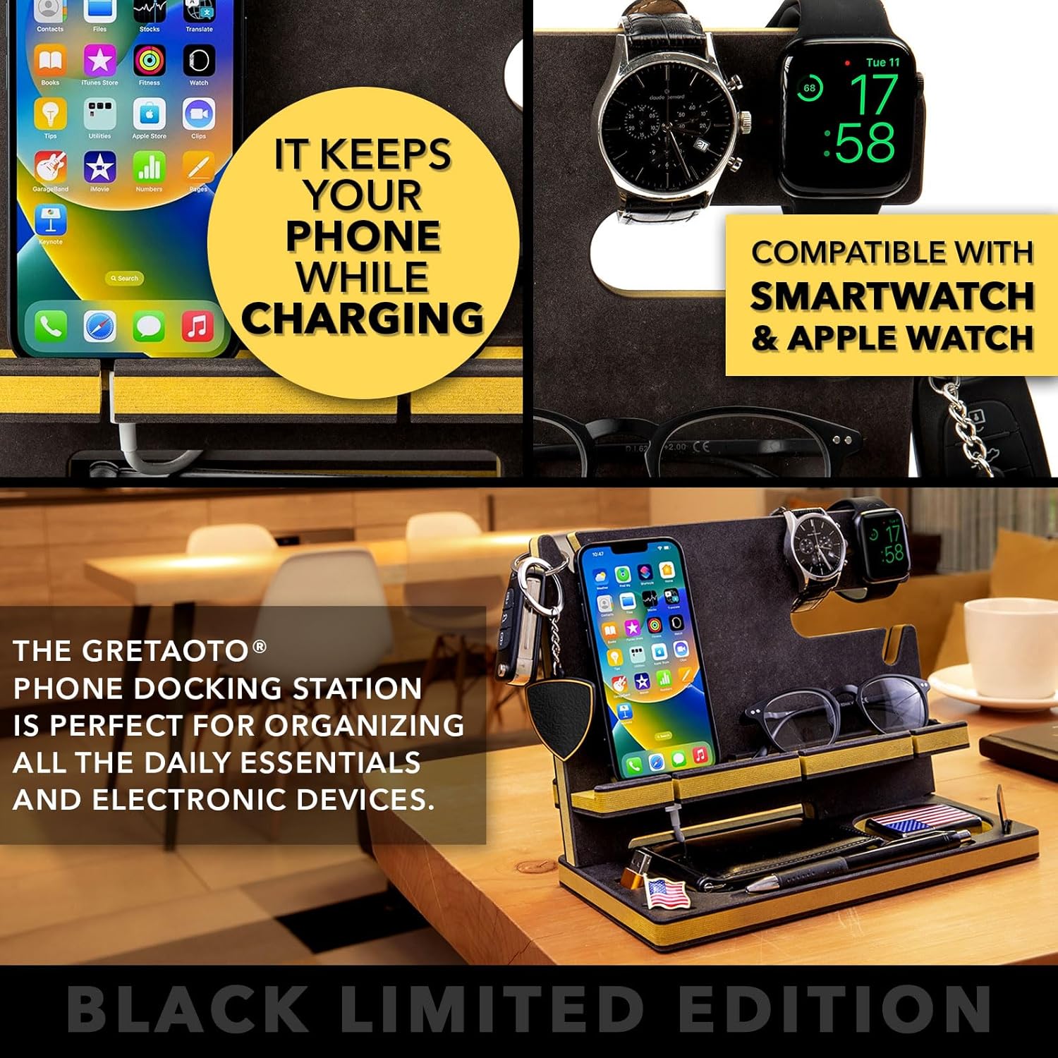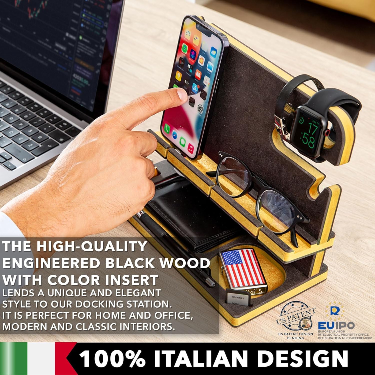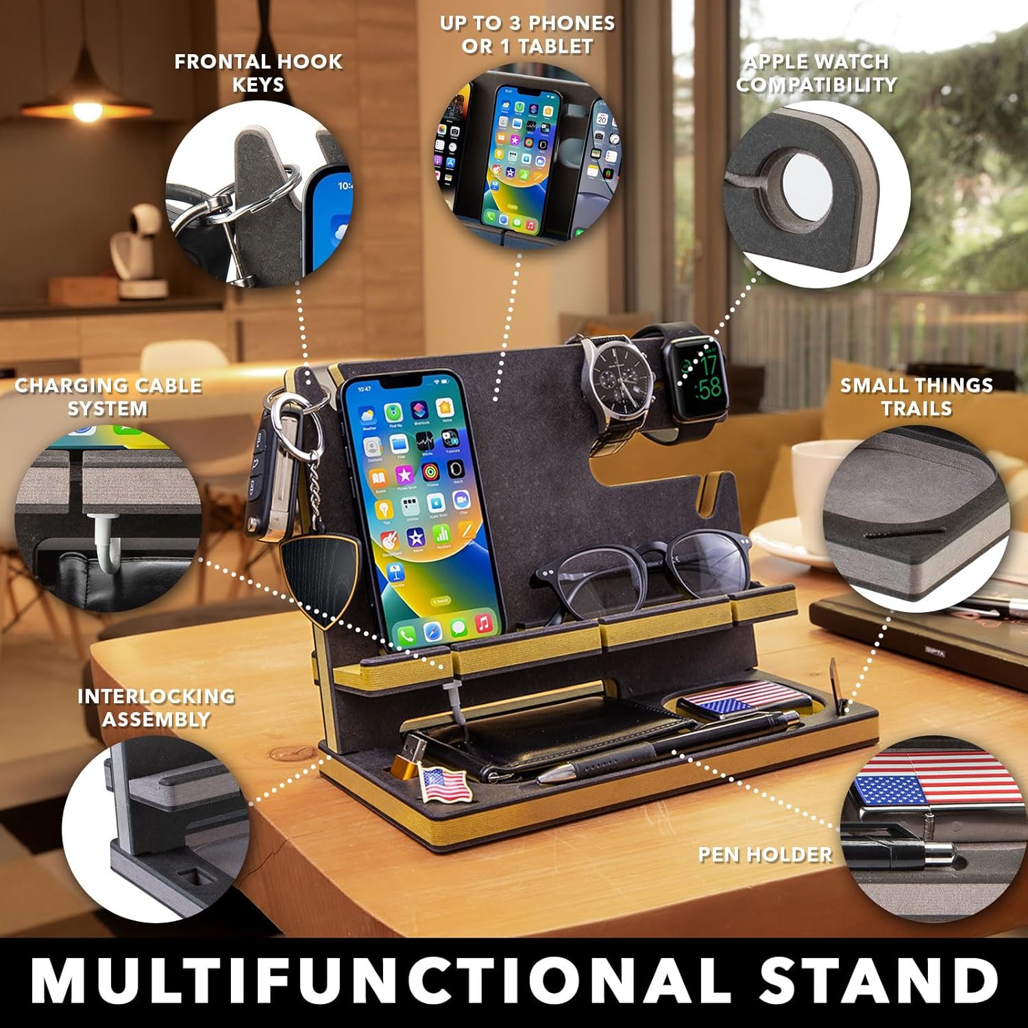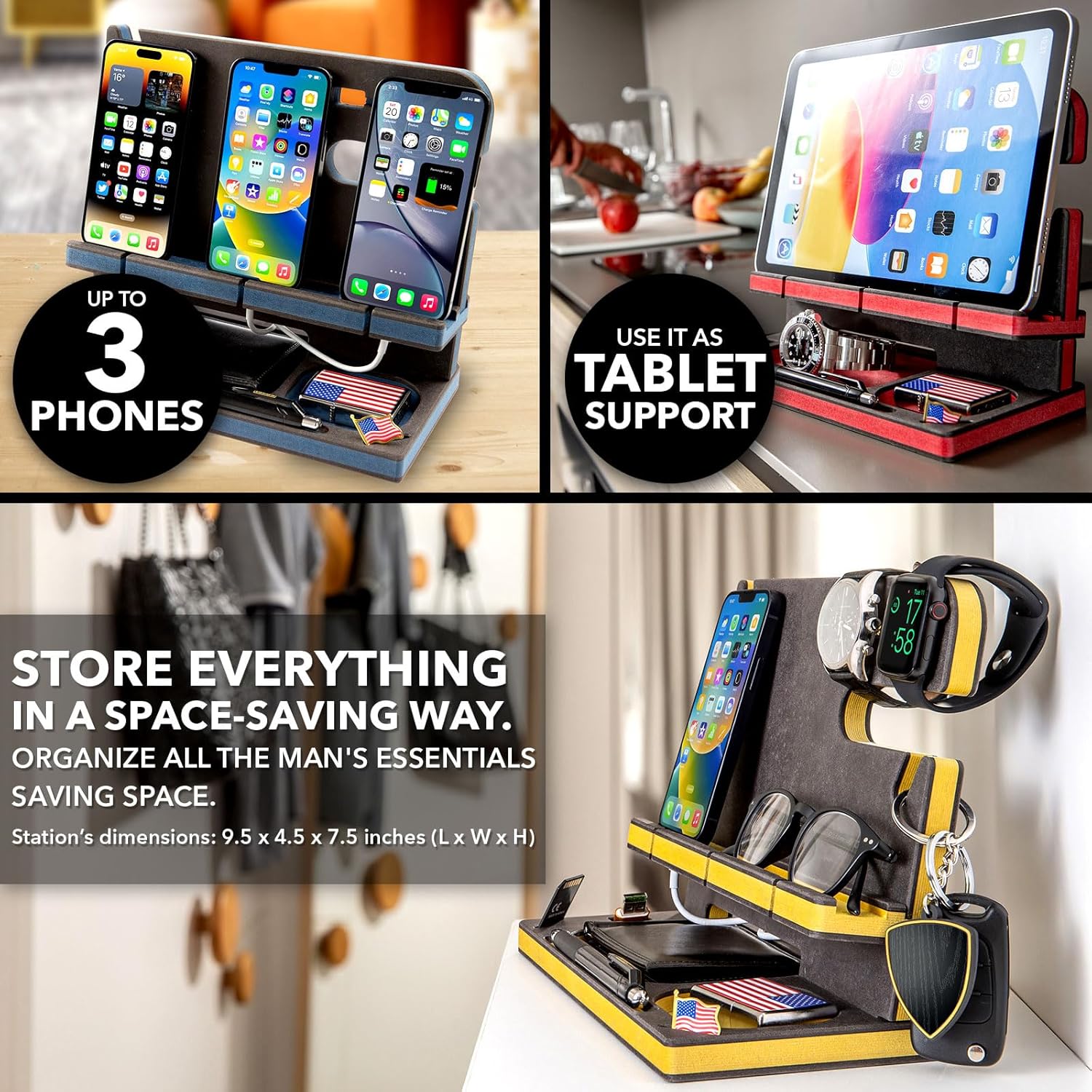 GRETAOTO Personalized Wooden Docking Station for Cell Phone, Tablet, Wallet, Gadgets, Accessories, Desk Organiser, Essentials, Storage Stand for Work Desk, Nightstand, Gifts for Men (Yellow)