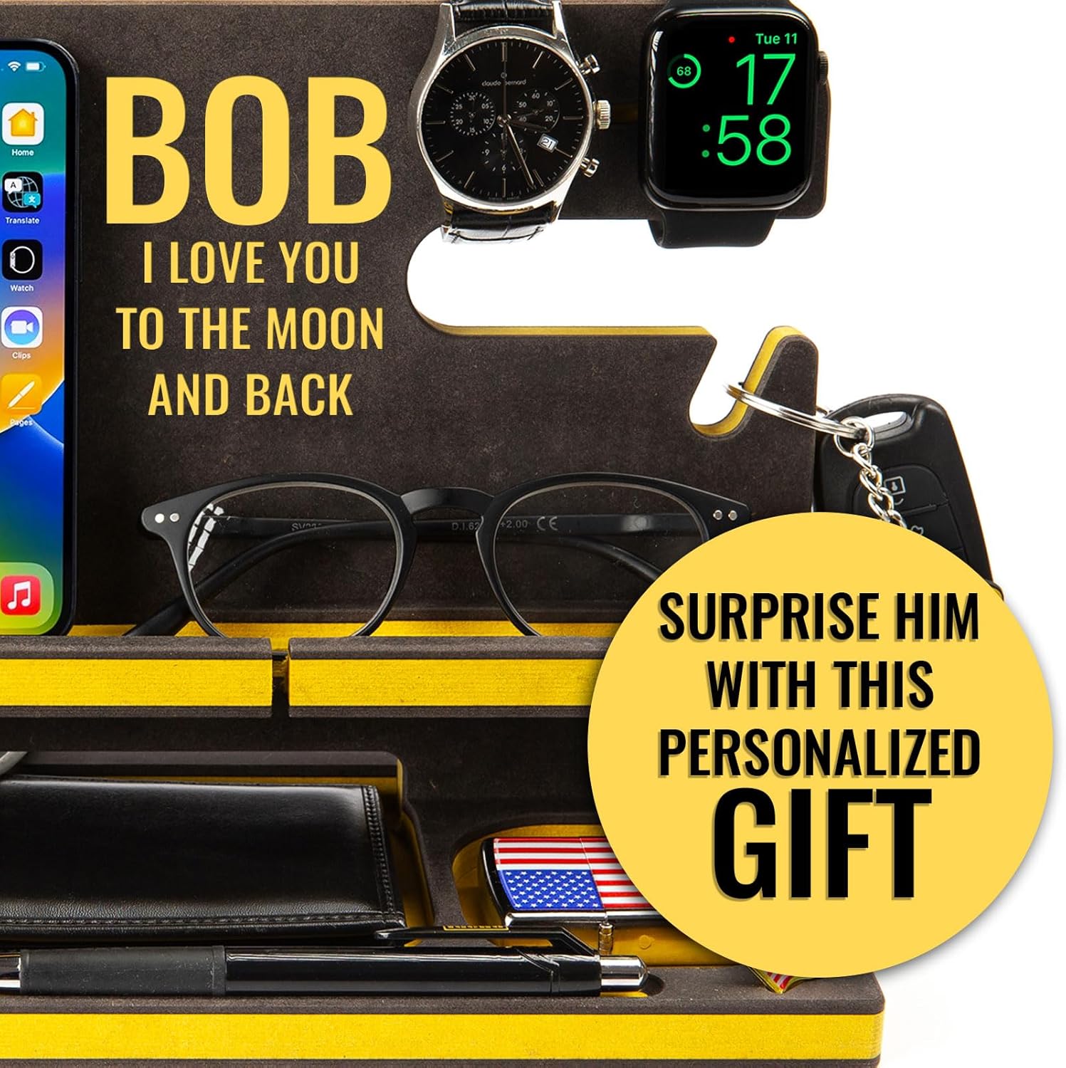 GRETAOTO Personalized Wooden Docking Station for Cell Phone, Tablet, Wallet, Gadgets, Accessories, Desk Organiser, Essentials, Storage Stand for Work Desk, Nightstand, Gifts for Men (Yellow)
