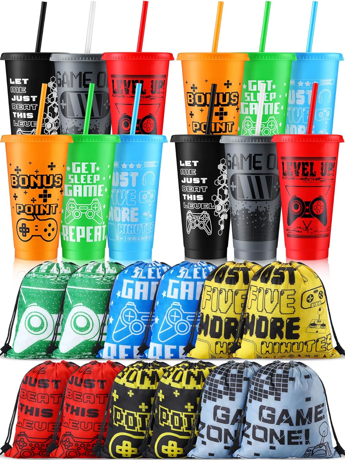 Mifoci 24 Pcs Video Game Party Favors, 12 Video Game Plastic Cups with Lids and Straws and 12 Drawstring Backpack, 24oz Reusable Tumble Bag for Gaming Party(Colorful)