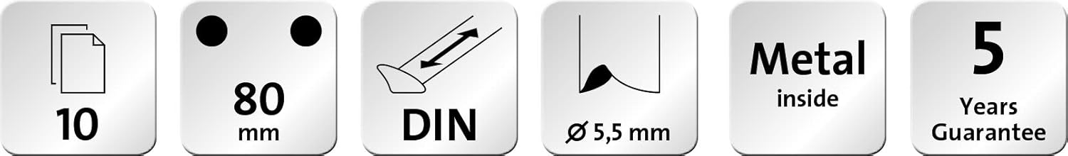 The perforator punches up to 10 sheets of paper. It has a locking stop rail with easy-to-read format display. The formats DIN A4, Q, DIN A5, DIN A6 and 3 x 8 can be punched