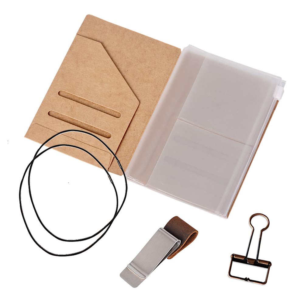 Passport Size Travelers Notebook Accessories Kit – Kraft File Folder, Zipper Case, Pen Holder, Binder Clip and 2 Elastic Bands