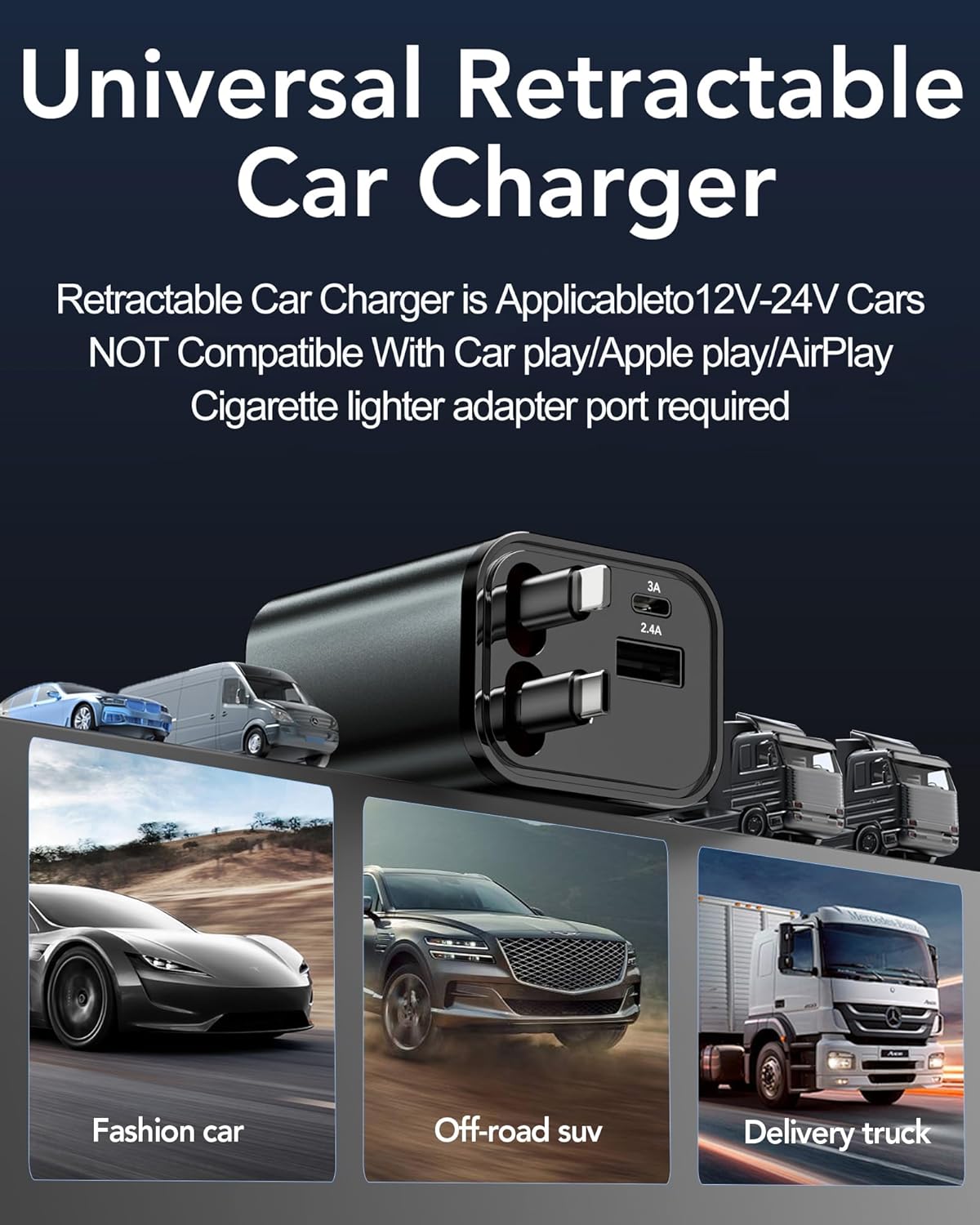 [NOT Compatible With Car play/Apple play/AirPlay] Please note the size of the product (5.12*1.77*1.50 in 117g/4.13oz) This car charger is only for charging. Our product support all cars with a cigarette jack/hole for the adapter plug in part to fit into. If cars only have USB jack holes, our product did not support.